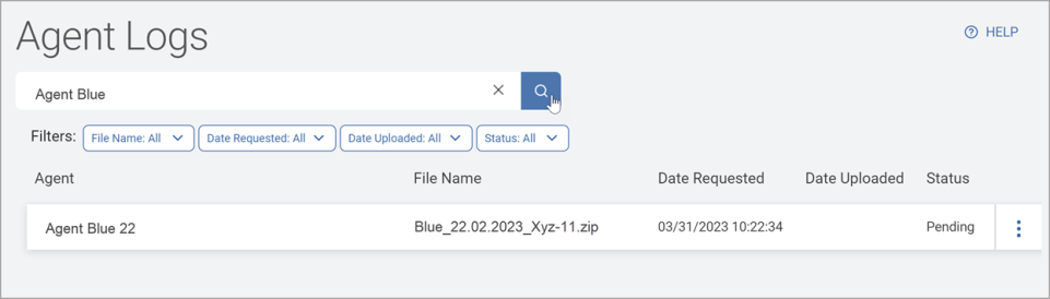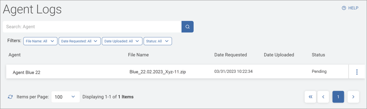 The Agent Logs page displays the agent logs collected via Gather Data requests.
