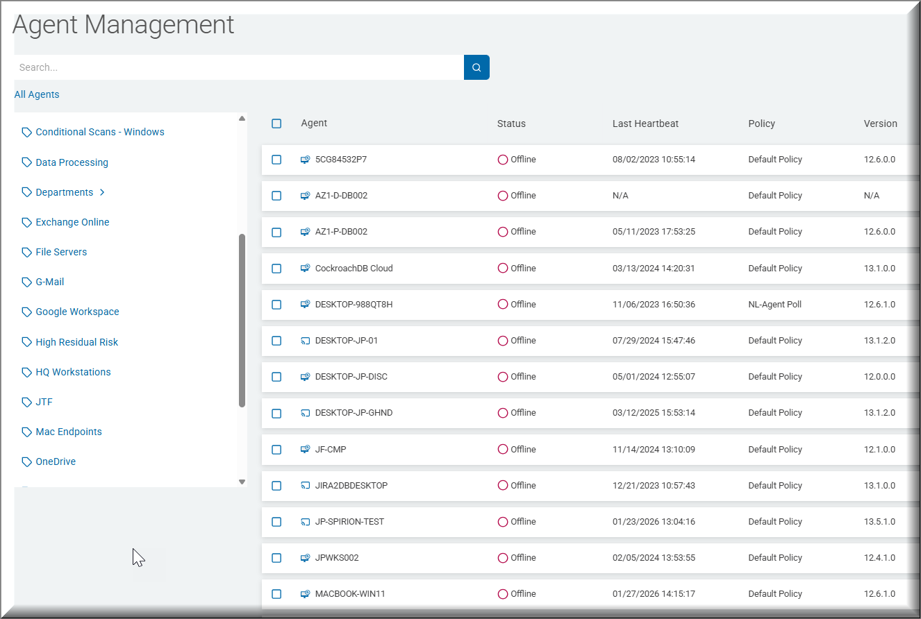 You manage your various Agents on the "Agent Management" page in Spirion Sensitive Data Platform.
