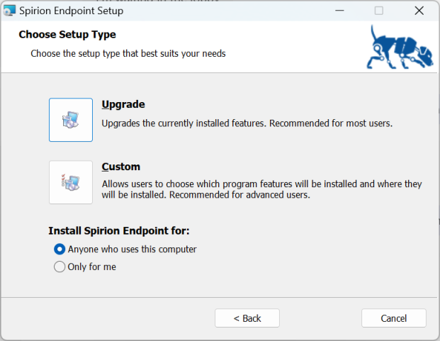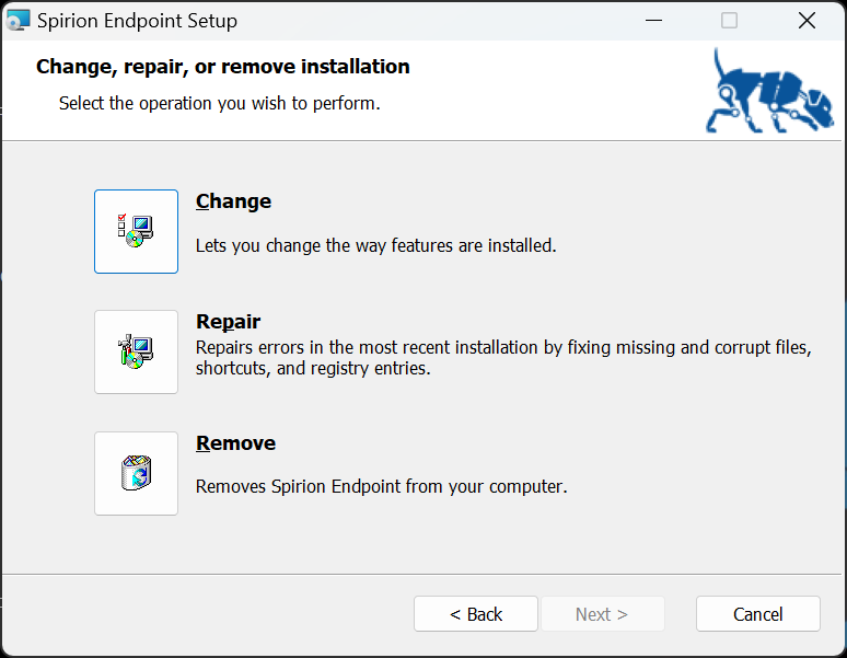 To change the way features are installed, repair errors in the installation by fixing missing or corrupt files, shortcuts, and registry entries, or to remove Spirion Endpoint version 13.6, re-launch the setup wizard and follow the appropriate prompts in the wizard.