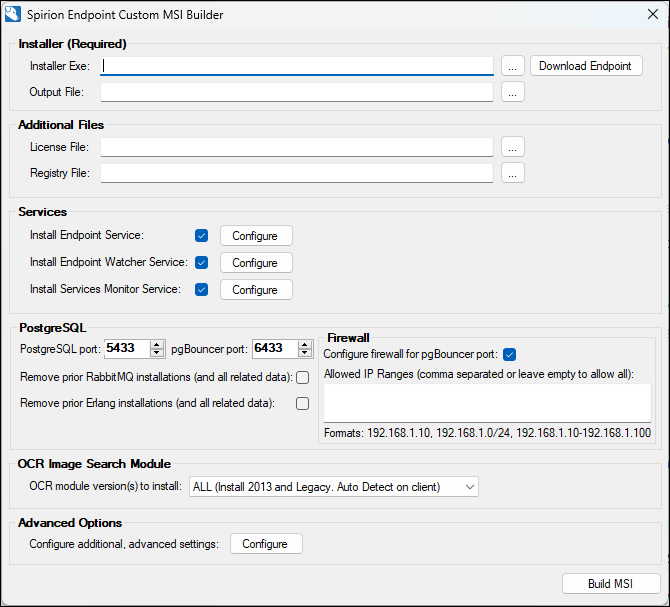 MSIBuilder13_6.zip - Use for version 13.6. Spirion Sensitive Data Platform Agents version 13.6+ use a separate MSI Builder as PostgreSQL and pgBouncer replace RabbitMQ and Erlang in this version.