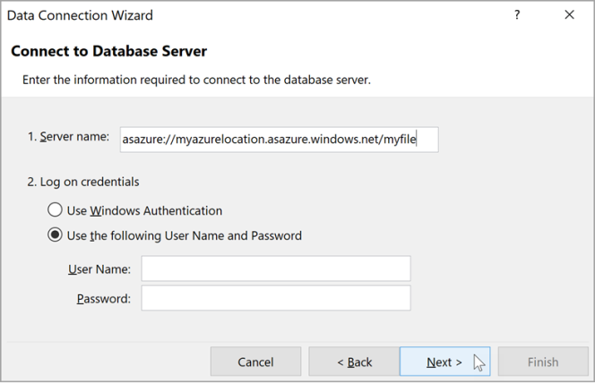 Log on credentials: Select Use the following User Name and Password and leave those fields blank.