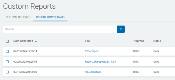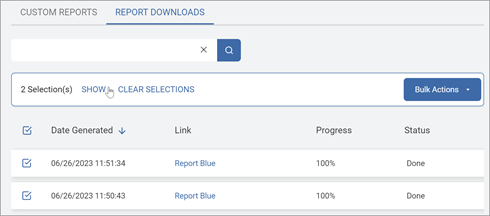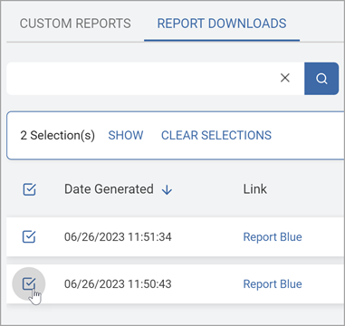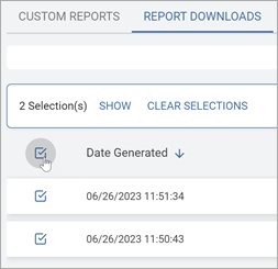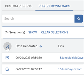 To select all Report downloads, click the Select All box to the left of the Date Generated columns.