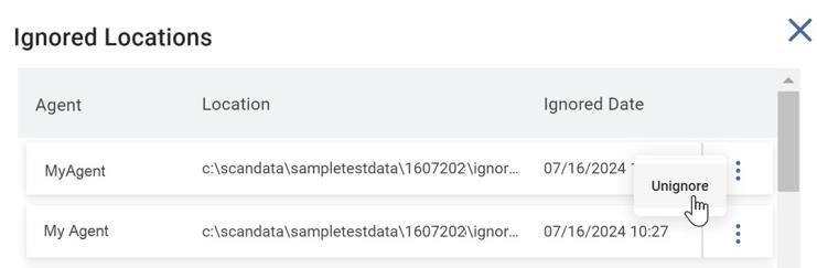 1. In the Ignored Locations pop-up window, find the Location you want to unignore.