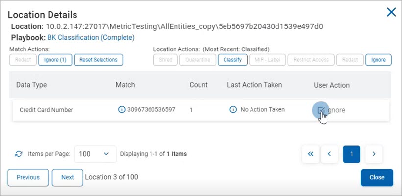 1. In the Location Details pop-up window, locate the record you want to ignore and in the User Action column, select Ignore.