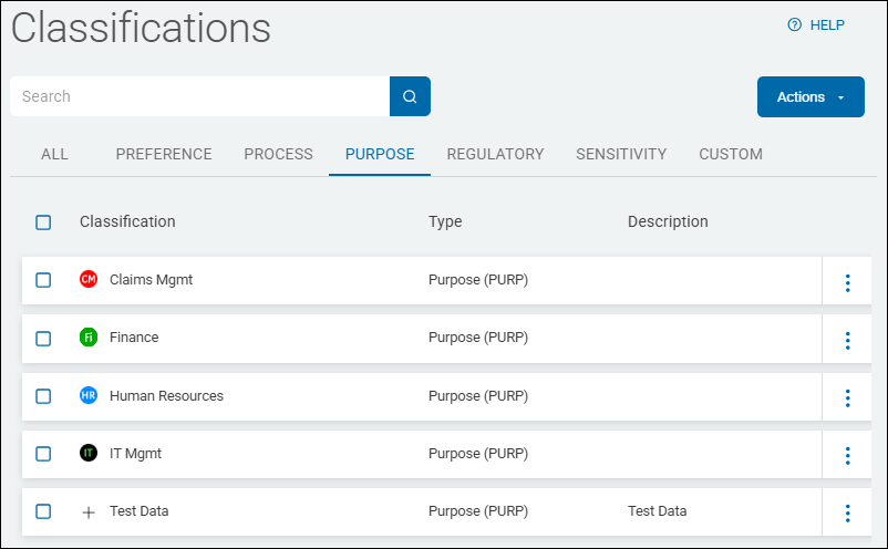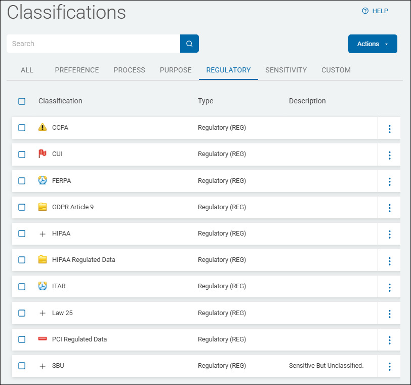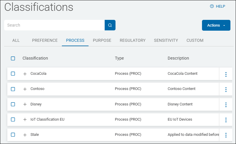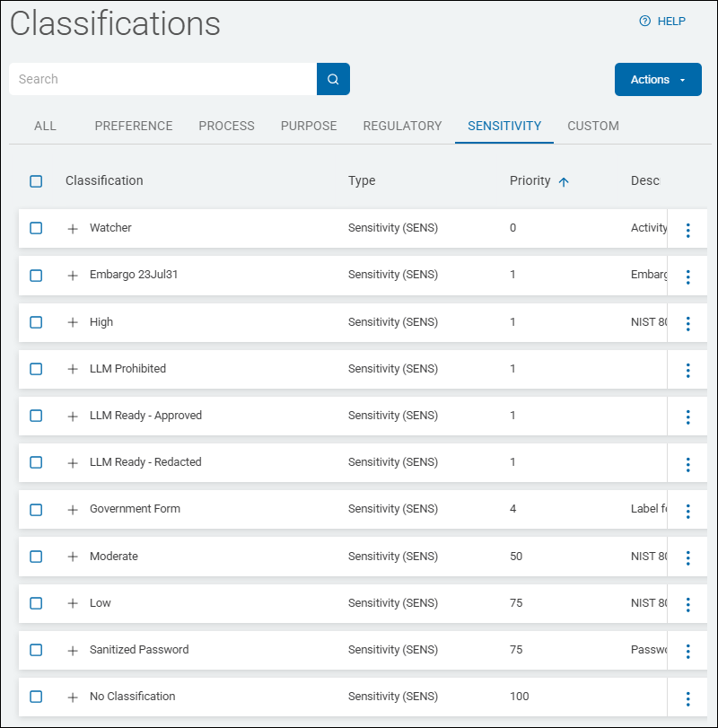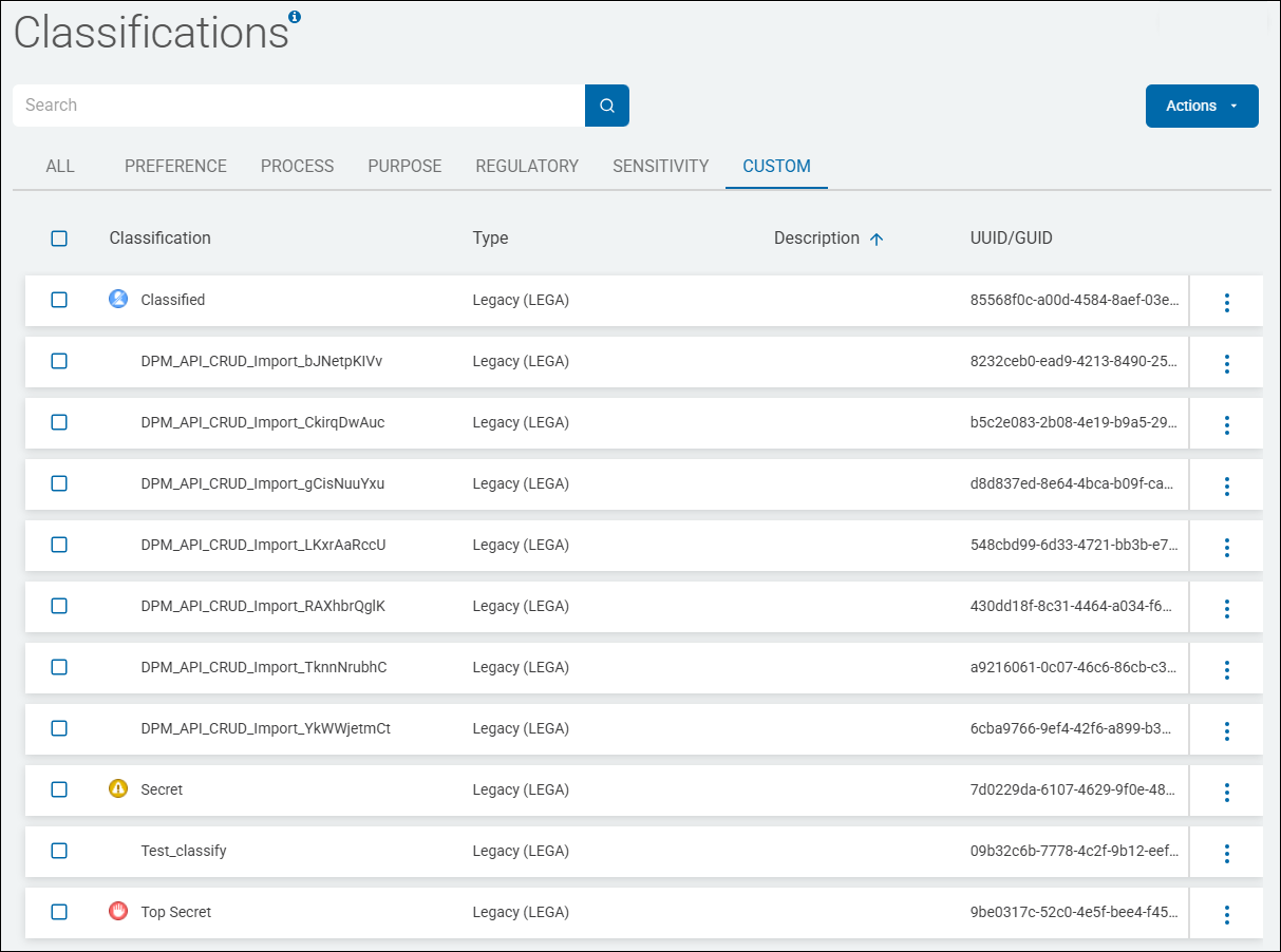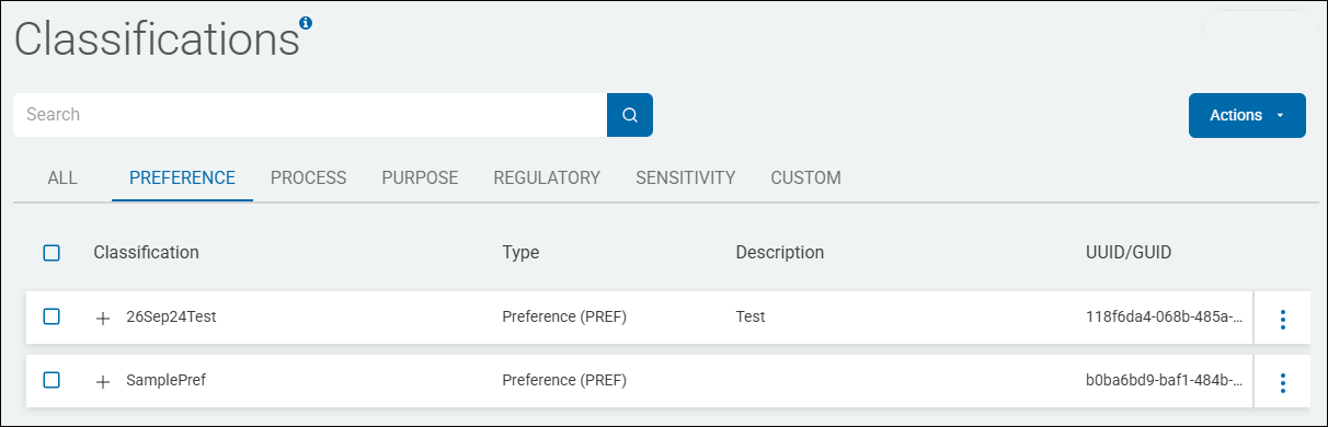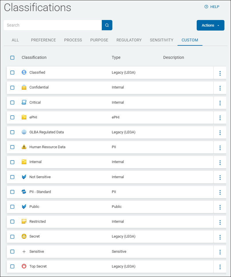 Classifications are displayed in a list sorted by columns (for examples, see Classification Type Examples below):